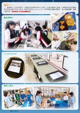 還有…… 能稱得上CNC科技時代,有關科技的環節當然不止這些,如果同學細心留意,不難發現我們校園四 周正悄悄地進行科技小革命︰教員室外的E-Learning Bar、科學學會的驅蚊磚製作、無人機障礙賽、機械 人製作等,Science is everywhere! 驅蚊磚製作 E-Learning Bar 機械人製作 7 یࠬ ϋ ˜