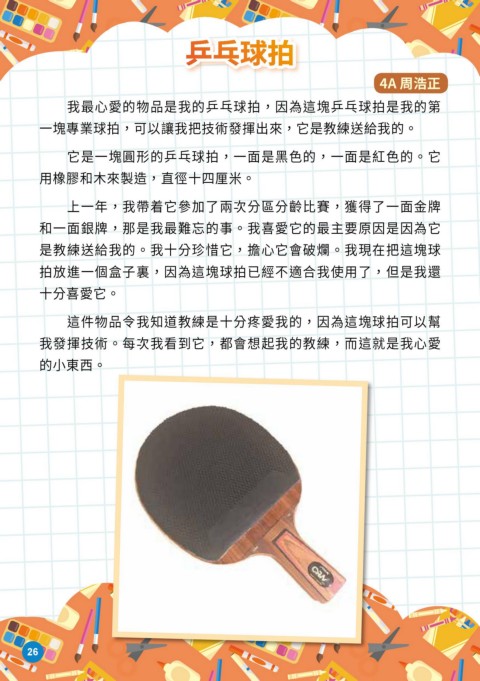 這件物品令我知道教練是十分疼愛我的,因為這塊球拍可以幫