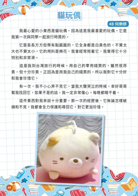 我最心愛的小東西是貓玩偶,因為這是我最喜愛的玩偶。它是