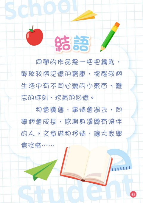 School 結語 同學的作品是一把把鑰匙, 開啟我們記憶的寶庫,提醒我們 生活中有不同心愛的小東西、難 忘的時刻、珍貴的回憶。 物會變舊,事情會過去,同 學們會成長,感謝身邊總有陪伴 的人。文章借物抒情,讓大家學 會珍惜…… Student 63