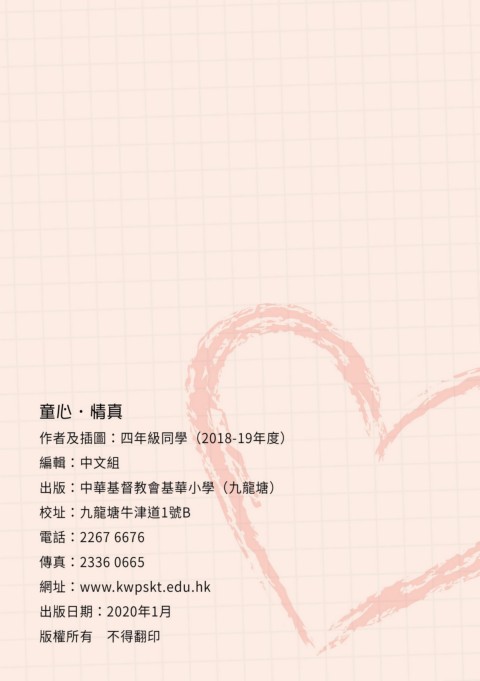 童心‧情真 作者及插圖:四年級同學(2018-19年度) 編輯:中文組 出版:中華基督教會基華小學(九龍塘) 校址:九龍塘牛津道1號B 電話:2267 6676 傳真:2336 0665 網址:www.kwpskt.edu.hk 出版日期:2020年1月 版權所有 不得翻印