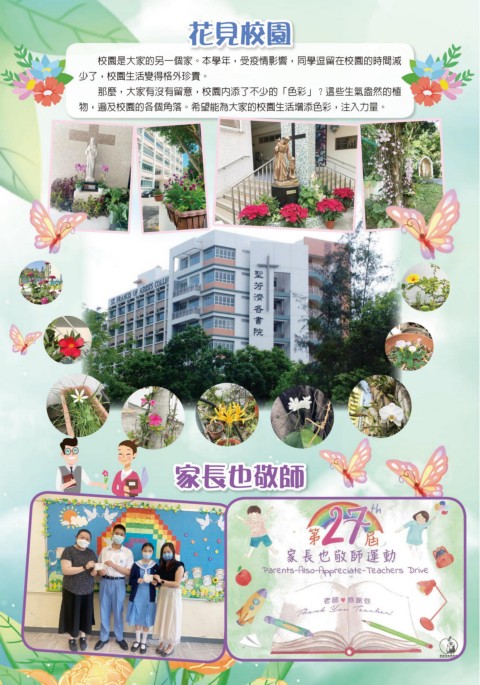 花見校園 校園是大家的另一個家。本學年,受疫情影響,同學逗留在校園的時間減 少了,校園生活變得格外珍貴。 那麼,大家有沒有留意,校園內添了不少的「色彩」?這些生氣盎然的植 物,遍及校園的各個角落。希望能為大家的校園生活增添色彩,注入力量。 家長也敬師