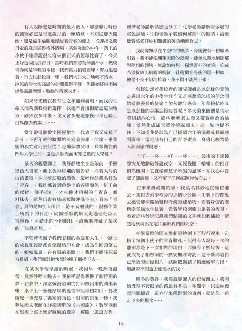 始,總是躡手躡腳地惶恐着青春的流去,從彈指之間 聽着莫名其妙和艱澀的英語漸漸昏去。