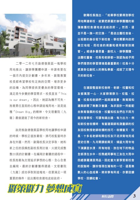 種「Dream Big」的精神,令文理書院(九 合教育發展的校舍。校董和校友們在不同方