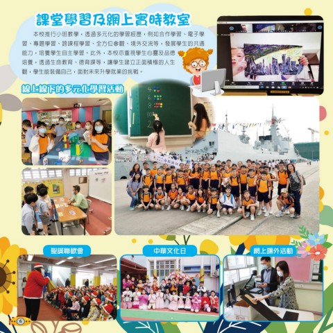 課程特色 課堂學習及網上實時教室 本校推行小班教學,透過多元化的學習經歷,例如合作學習、電子學 習、專題學習、跨課程學習、全方位參觀、境外交流等,發展學生的共通 能力,培養學生自主學習。此外,本校亦重視學生心靈及品德 培養,透過生命教育、德育課等,讓學生建立正面積極的人生 觀,學生能裝備自己,面對未來升學就業的挑戰。 線上線下的多元化學習活動 聖誕聯歡會 中華文化日 網上課外活動 6