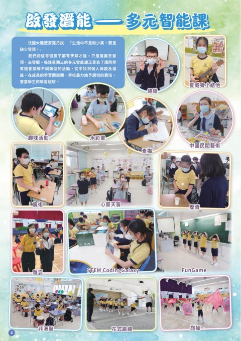 啟發潛能-多元智能課 法國大雕塑家羅丹說︰「生活中不是缺少美,而是 缺少發現。」 我們相信每個孩子都有天賦才能,只是需要去發 現,去發掘。每逢星期三的多元智能課正是為了讓同學 有機會接觸不同類型的活動,從中找到個人興趣及潛 能。在成長的學習關鍵期,學校盡力給予適切的栽培, 豐富學生的學習經驗。 夏威夷小結他 繩結 趣味活動 水彩畫 中國民間藝術 素描 魔術 心靈天窗 歷奇 STEM CodingGalaxy FunGame 雜耍 非洲鼓 花式跳繩 旗操 6