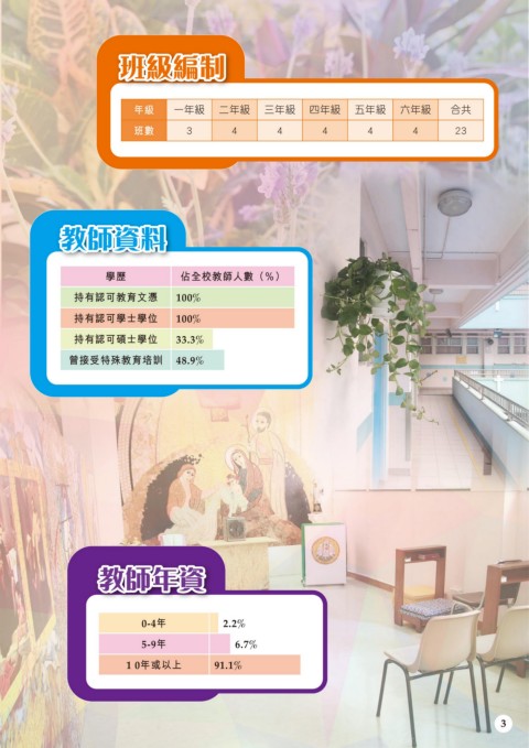 班級編制 班級編制 年級 一年級 二年級 三年級 四年級 五年級 六年級 合共 班數 3 4 4 4 4 4 23 教師資料 教師資料 學歷 佔全校教師人數(%) 持有認可教育文憑 100% 持有認可學士學位 100% 持有認可碩士學位 33.3% 曾接受特殊教育培訓 48.9% 教師年資 教師年資 0-4年 2.2% 5-9年 6.7% 1 0年或以上 91.1% 3 3