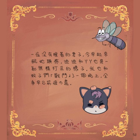 一 夜 沒 有 睡 著 的 妻 子 , 今 早 起 來 說 她 頭 疼 , 迪 迪 和 丫 丫 也 是 一 副 無 精 打 采 的 樣 子 。 我 也 和 蚊 子 們 「 戰 鬥 」 了 一 個 晚 上 , 全 身 早 已 筋 疲 力 盡 。 53