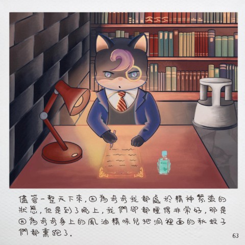 儘 管 一 整 天 下 來 , 因 為 奇 奇 我 都 處 於 精 神 緊 張 的 狀 態 , 但 是 到 了 晚 上 , 我 們 卻 都 睡 得 非 常 好 , 那 是 因 為 奇 奇 身 上 的 風 油 精 味 兒 把 洞 裡 面 的 秋 蚊 子 們 都 熏 跑 了 。 63