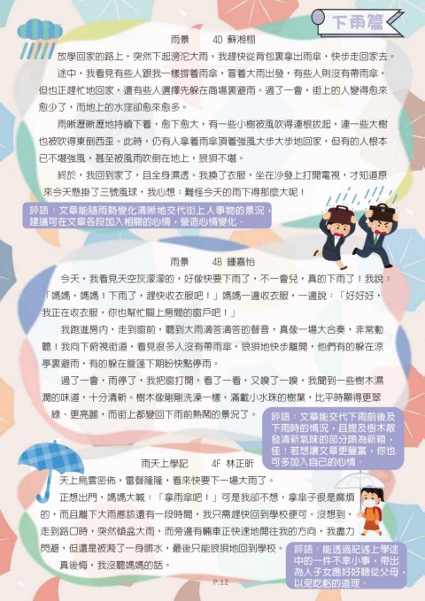 評語:文章能隨雨勢變化清晰地交代街上人事物的景況, 評語:文章能隨雨勢變化清晰地交代街上人事物的景況,