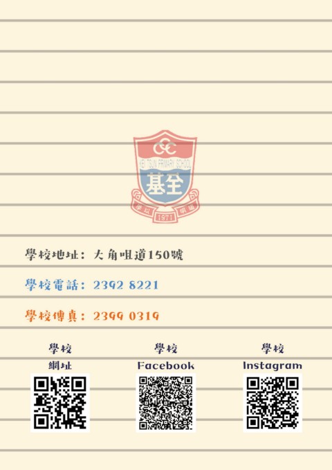 學校地址:大角咀道150號 學校電話:2392 8221 學校傳真:2399 0319 學校 學校 學校 網址 Facebook Instagram