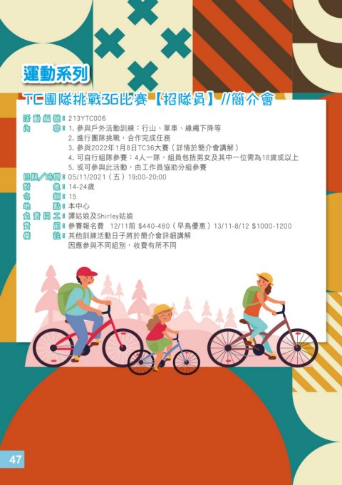 內 容 : 1. 參與戶外活動訓練:行山、單車、緣繩下降等