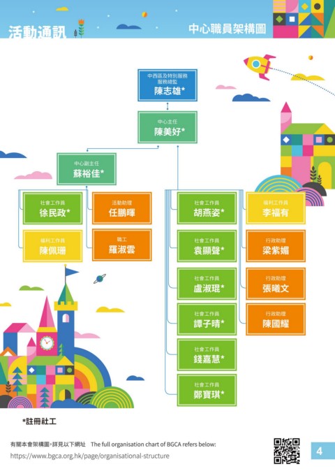 中心職員架構圖 中心職員架構圖 中⻄區及特別服務 服務總監 陳志雄* 中心主任 陳美好* 中心副主任 蘇裕佳* 社會工作員 活動助理 社會工作員 福利工作員 徐民政* 任鵬暉 胡燕姿* 李福有 福利工作員 職工 社會工作員 行政助理 陳佩珊 羅淑雲 袁顯聲* 梁紫媚 社會工作員 行政助理 盧淑琨* 張曦文 社會工作員 行政助理 譚子晴* 陳國耀 社會工作員 錢嘉慧* 社會工作員 鄭寶琪* *註冊社工 4