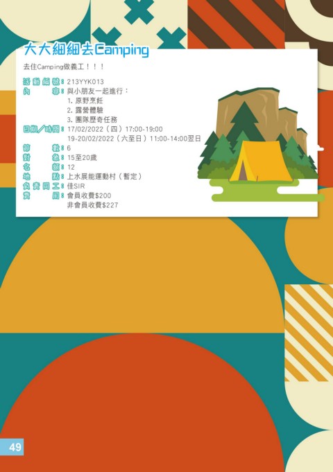 大大細細去Camping 去住Camping做義工!!! 活動編號: 213YYK013 內 容 : 與小朋友一起進行: 1. 原野烹飪 2. 露營體驗 3. 團隊歷奇任務 日期/時間: 17/02/2022(四)17:00-19:00 19-20/02/2022(六至日)11:00-14:00翌日 節 數 : 6 對 象 : 15至20歲 名 額 : 12 地 點 : 上水展能運動村(暫定) 負責同工: 佳SIR 費 用 : 會員收費$200 非會員收費$227 49