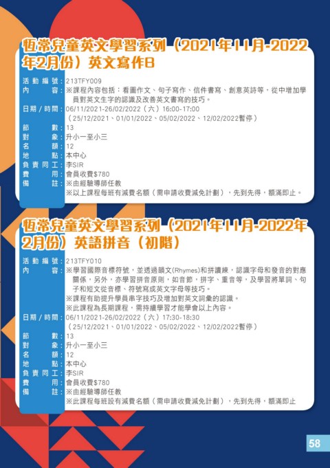 日期/時間: 06/11/2021-26/02/2022(六)17:30-18:30