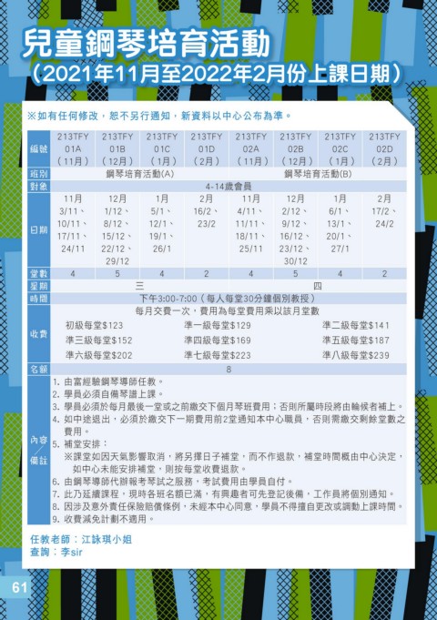 備註 ※課堂如因天氣影響取消,將另擇日子補堂,而不作退款,補堂時間概由中心決定,