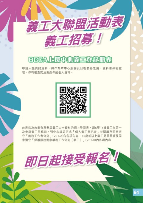 義工大聯盟活動表 義工招募! BGCA上環中心義工登記簡表 申請人提供的資料,將作為本中心服務及日後聯絡之用,資料會保密處 理,你有權查閱及更改你的個人資料。 此表格為收集有意參與義工人士資料的網上登記表,請6至14歲義工在第一 次參與義工服務前,到中心填妥正式「個人義工登記表」並閱讀及同意遵 守「義務工作者守則」(V01-A)內各項內容,15歲或以上義工另需閱讀及同 意遵守「保護服務對象權利工作守則(義工)」(V01-B)內各項內容 即日起接受報名! 64