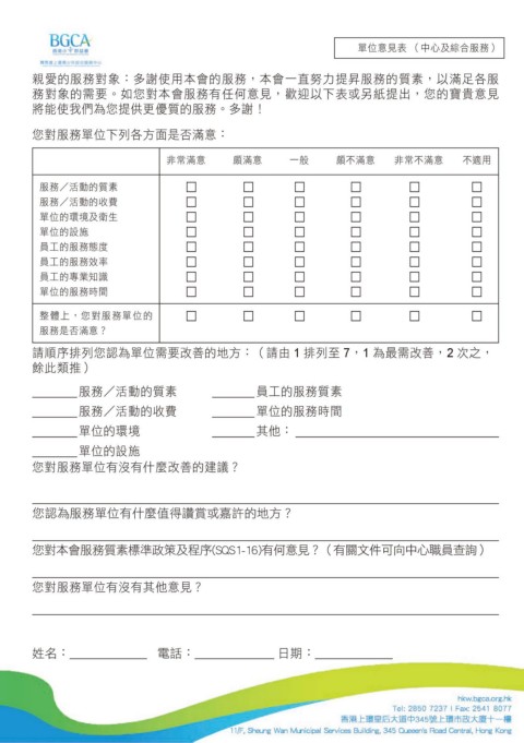 務對象的需要。如您對本會服務有任何意見,歡迎以下表或另紙提出,您的寶貴意見