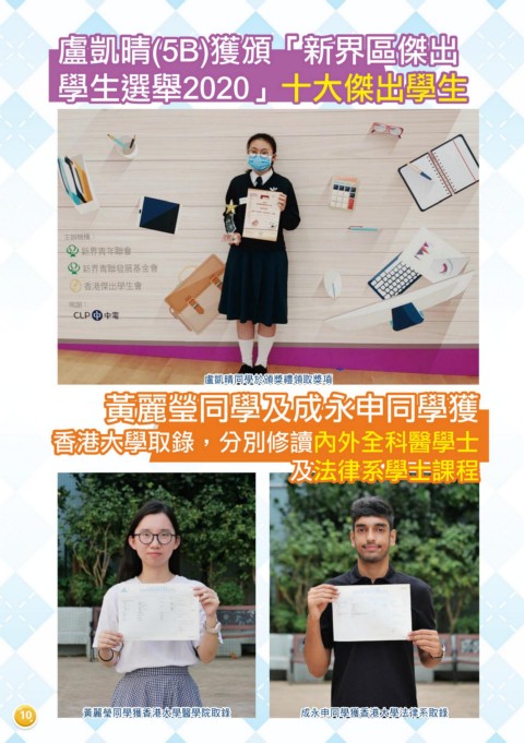 盧凱晴(5B)獲頒「新界區傑出 學生選舉2020」十大傑出學生 盧凱晴同學於頒獎禮領取獎項 黃麗瑩同學及成永申同學獲 香港大學取錄,分別修讀內外全科醫學士 及法律系學士課程 10 黃麗瑩同學獲香港大學醫學院取錄 成永申同學獲香港大學法律系取錄