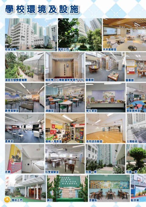 學 校 環 境 及 設 施 校舍全貌 學校正門 未來實驗室 溫室及蝴蝶養殖園 翁祐博士立體動畫教學製作中心 圖書館 圖書館 數學實驗室 通識室 學生會室 運動器械室 音樂室 機械人學會室 多用途活動室 太陽能板 走廊 科學實驗室 校園一景 校園一景 4 學校正門 講台 漂書點 籃球場