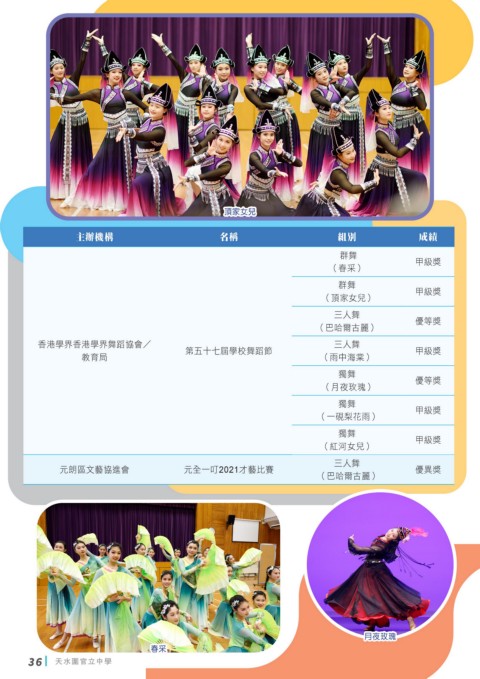 頂家女兒 頂家女兒 主辦機構 名稱 組別 成績 群舞 (春采) 甲級獎 群舞 (頂家女兒) 甲級獎 三人舞 (巴哈爾古麗) 優等獎 香港學界香港學界舞蹈協會/ 三人舞 教育局 第五十七屆學校舞蹈節 (雨中海棠) 甲級獎 獨舞 (月夜玫瑰) 優等獎 獨舞 (一硯梨花雨) 甲級獎 獨舞 甲級獎 (紅河女兒) 三人舞 元朗區文藝協進會 元全一叮2021才藝比賽 優異獎 (巴哈爾古麗) 月夜玫瑰 月夜玫瑰 春采 春采 36 ˂˥ఖ֜ͭʕኪ