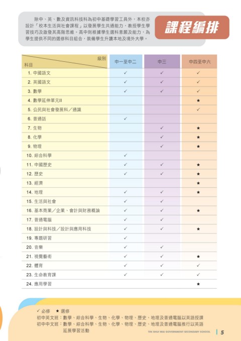 初中中文班:數學、綜合科學、生物、化學、物理、歷史、地理及普通電腦推行以英語