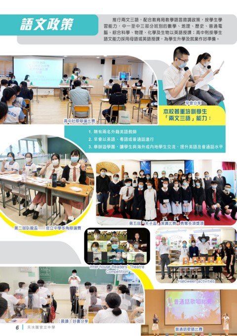 語文政策 推行兩文三語,配合教育局教學語言微調政策,按學生學