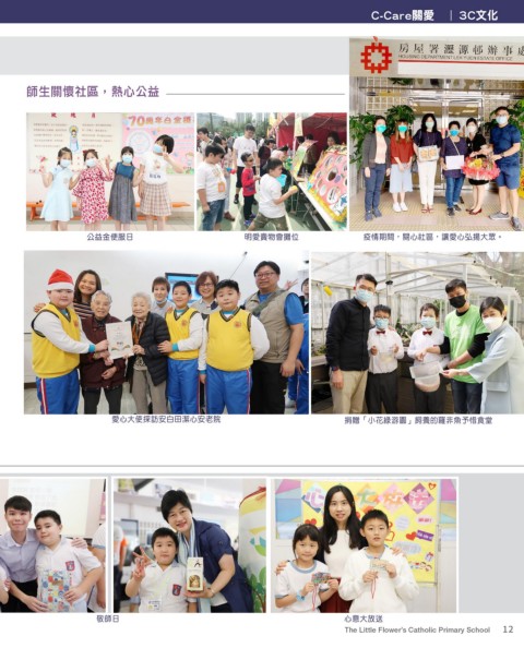 C-Care關愛 3C文化 師生關懷社區,熱心公益 公益金便服日 明愛賣物會攤位 疫情期間,關心社區,讓愛心弘揚大眾。 愛心大使探訪安白田潔心安老院 捐贈「小花綠游園」飼養的羅非魚予惜食堂 敬師日 心意大放送 The Little Flower’s Catholic Primary School 12