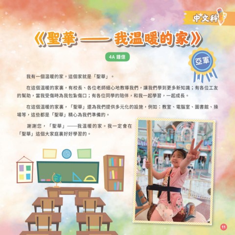 中文科 《聖華-我温暖的家》 4A 鍾億 亞軍 我有一個温暖的家,這個家就是「聖華」。 在這個温暖的家裏,有校長、各位老師細心地教導我們,讓我們學到更多新知識;有各位工友 的幫助,當我受傷時為我包紮傷口;有各位同學的陪伴,和我一起學習,一起成長。 在這個温暖的家裏,「聖華」還為我們提供多元化的設施,例如:教室、電腦室、圖書館、操 場等,這些都是「聖華」精心為我們準備的。 謝謝您,「聖華」 我温暖的家。我一定會在 「聖華」這個大家庭裏好好學習的。 11