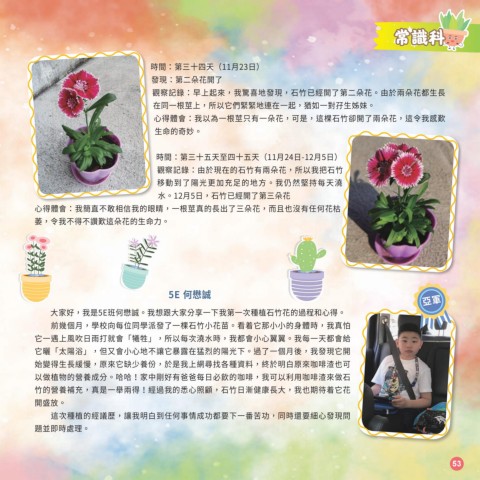 大家好,我是5E班何懋誠。我想跟大家分享一下我第一次種植石竹花的過程和心得。