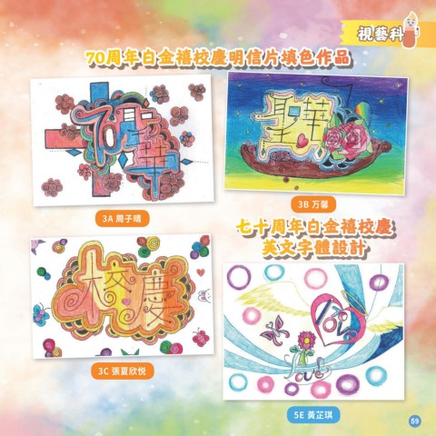 視藝科 70周年白金禧校慶明信片填色作品 3B 万馨 七十周年白金禧校慶 3A 周子晴 英文字體設計 3C 張夏欣悦 5E 黃芷琪 59