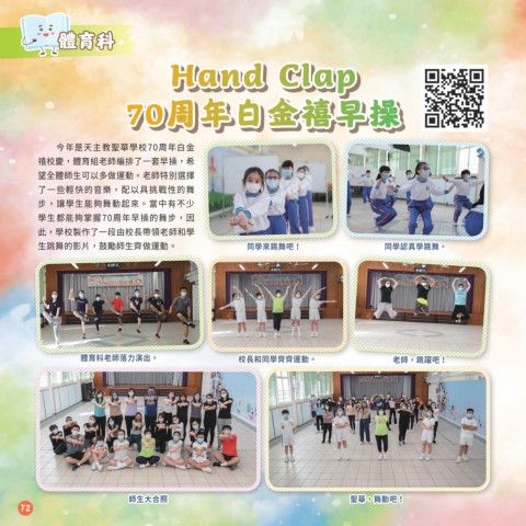 體育科 Hand Clap 70周年白金禧早操 今年是天主教聖華學校70周年白金 禧校慶,體育組老師編排了一套早操,希 望全體師生可以多做運動。老師特別選擇 了一些輕快的音樂,配以具挑戰性的舞 步,讓學生能夠舞動起來。當中有不少 學生都能夠掌握70周年早操的舞步,因 此,學校製作了一段由校長帶領老師和學 生跳舞的影片,鼓勵師生齊做運動。 同學來跳舞吧! 同學認真學跳舞。 體育科老師落力演出。 校長和同學齊齊運動。 老師,跳躍吧! 師生大合照 聖華,舞動吧! 72