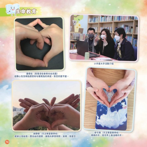 生命教育 小手愛大手活動介紹 潘禮信(真理浸信會榮光幼兒園) 這顆心包含姆指讚賞和勾著尾指的承諾,對您的愛不變。 麥可喬(天主教聖華學校) 謝顥郗(天主教聖華學校) 媽媽的手,是世界上最溫暖的手。 感謝父母給我一雙自由的翅膀,讓我向夢想飛翔,爸媽,我愛您! 74