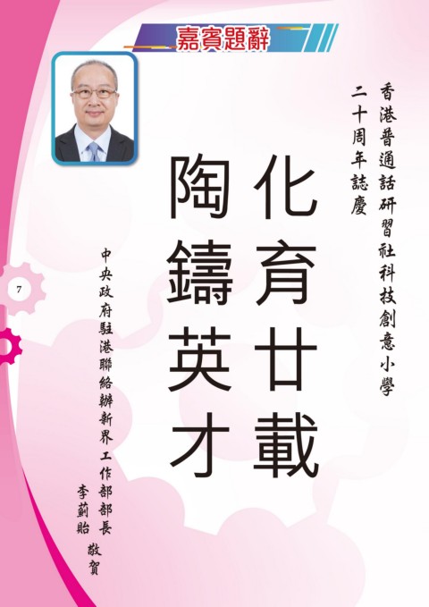 嘉賓題辭 年 周 慶 誌 十 二 港 香 創 技 科 學 小 意 話 通 普 社 習 研 嘉賓題辭 英 才 陶 鑄 化 育 聯 絡 辦 港 政 府 駐 部 部 長 作 新 界 工 央 中 載 廿 7 貽 薊 李 賀 敬