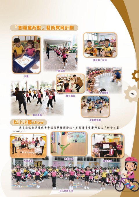 「創藝童起動」藝術教育計劃 「創藝童起動」藝術教育計劃 夏威夷小結他 夏威夷小結他 中國武術 中國武術 沙畫 沙畫 水桶敲擊 水桶敲擊 92 舞台魔術 舞台魔術 創作舞蹈 創作舞蹈 皮影戲偶劇 皮影戲偶劇 科小才藝show 科小才藝show 為了提供更多展現平台讓同學發揮潛能,本校每年會舉行五次「科小才藝 show」。 武術表演 武術表演 西樂表演 西樂表演 鋼琴表演 鋼琴表演 花式跳繩表演 花式跳繩表演