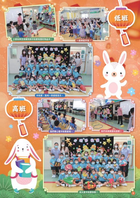 低班 小朋友將豆袋擲到與中秋節有關的物品中。 一起舉起手來。 中秋節,我哋一齊提燈賞月。 高班 我們專心看中秋節劇場。 我們來跳籐圈玩遊戲! 祝大家中秋節快樂! 9