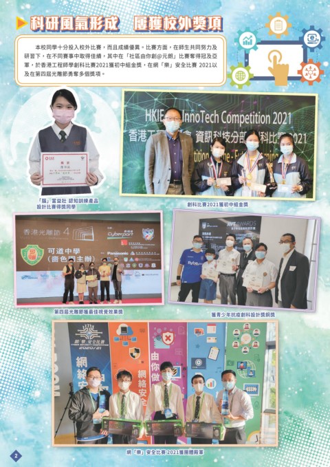 科研風氣形成 屢獲校外獎項 本校同學十分投入校外比賽,而且成績優異。比賽方面,在師生共同努力及 研習下,在不同賽事中取得佳績,其中在「社區由你創@元朗」比賽奪得冠及亞 軍,於香港工程師學創科比賽2021獲初中組金獎,在網「樂」安全比賽 2021以 及在第四屆光雕節勇奪多個獎項。 「腦」當益壯 認知訓練產品 創科比賽2021獲初中組金獎 設計比賽得獎同學 第四屆光雕節獲最佳視覺效果獎 獲青少年抗疫創科設計獎銅獎 2 網「樂」安全比賽 2021獲團體殿軍