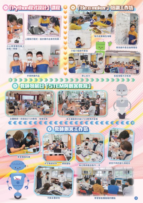 「Python程式設計」課程 「Be a maker」培訓工作坊 製作成果報告海報 上載執行程式,設計顯示出來的效果。 小心檢查麵包板上 修改創作意念後再報告 的每一條線 介紹小組創作意念 手號辨識作品 齊心合力 各組海報大功告成 教師發展日「STEM與創客教育」 全體教師一同增加STEM教育,增進知識。 與主講嘉賓討論STEM教育的發展 教師創客工作坊 學習種植知識 中文教師本色-摘錄重點 研究不同的變化與組合 每位教師親自製作一次 不斷反覆研究 學習智能種植箱的難點 4