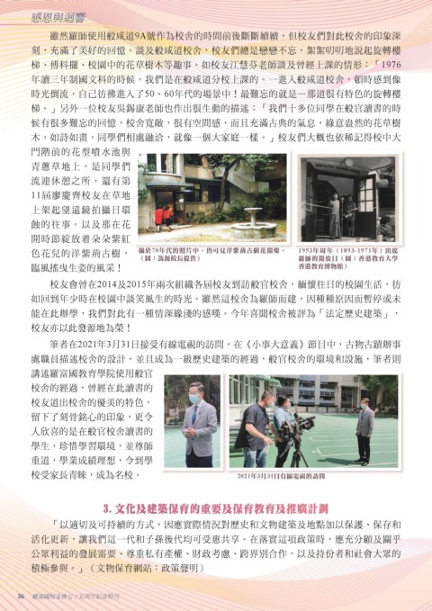 處職員描述校舍的設計,並且成為一級歷史建築的經過,般官校舍的環境和設施,筆者則