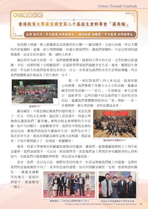 圈。幸而,前輩們都十分照顧我們,在迎新營帶領我們適應舍堂生活。後來,聽聞宿生會