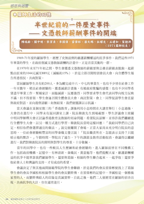 1969-71年度的羅師學生,經歷了史無前例的維護薪酬權益的抗爭事件。我們這些1971