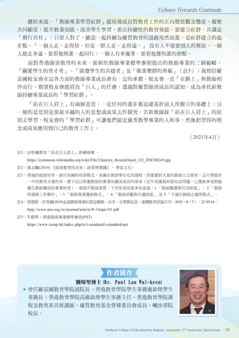 伴而行。期望校友會能肩負「巨人」的任務,透過對優質師資成長的認知,成為承托新教