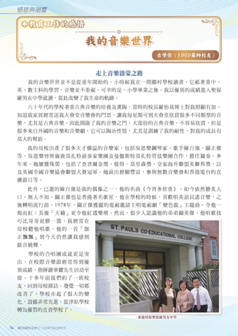 我的母校出產了很多天才橫溢的音樂家,包括吳恩樂鋼琴家、歌手陳百強、關正傑