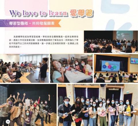 We love to learn 愛學習 學習型團隊‧共同發展願景 為建構學校成為學習型組織,學校安排全體教職員一起參加專業培 訓,透過工作坊及發展活動,加深教職員間的了解及信任,同時強化了學 校不同部門仝工的共同發展願景,進一步建立互相間的默契,在溝通上找 到共同語言。 34