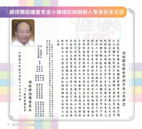 順德聯誼總會李金小學碑記與創辦人李金先生玉照 2 順德聯誼總會李金小學