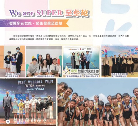 We are SUPER 至卓越 發展多元智能‧碩果纍纍至卓越 學校積極發掘學生強項,透過多元化活動讓學生發揮所長,達至全人發展。過去十年,李金小學學生在課外活動、校內外比賽 或國際考試等均有卓越表現。教師團隊力求創新、進步,獲得不少專業獎項。 TOEFL考試獲 教育局教育城主辦 全港最高成績 2021國際電子數學科銀獎 「樂繫校園獎勵計劃」全港傑出學校大奬 第二屆創新教師獎 38
