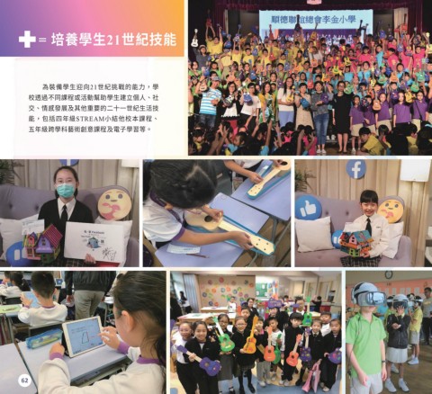 = 培養學生21世紀技能 為裝備學生迎向21世紀挑戰的能力,學 校透過不同課程或活動幫助學生建立個人、社 交、情感發展及其他重要的二十一世紀生活技 能,包括四年級STREAM小結他校本課程、 五年級跨學科藝術創意課程及電子學習等。 62