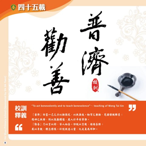 四十五載 校 Ho Shun Primary School (Sponsored by Sik Sik Yuen) 訓 校訓 “To act benevolently and to teach benevolence”~ teaching of Wong Tai Sin 釋義 「普濟」即盡一己之力以助困厄,以扶無依。物質之樂助,見諸慷慨解囊; 精神之扶持,則以鼓勵關懷,度人於平安寧靜。 「勸善」乃以言以行,導人向善。即既以言教,循循善誘; 或以身教,樹立榜樣。祈能改造心靈,化戾氣為祥和。 9
