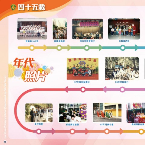 四十五載 教職員大合照 區際運動會 家長教師會成立 家教會活動 年代 照片 Ho Shun Primary School (Sponsored by Sik Sik Yuen) 97年慶回歸攤位 93年學校旅行 聯校畢業典禮話劇(二) 學校旅影 校慶攤位遊戲 97年升旗小組 慶回歸校內攤 位遊戲 15
