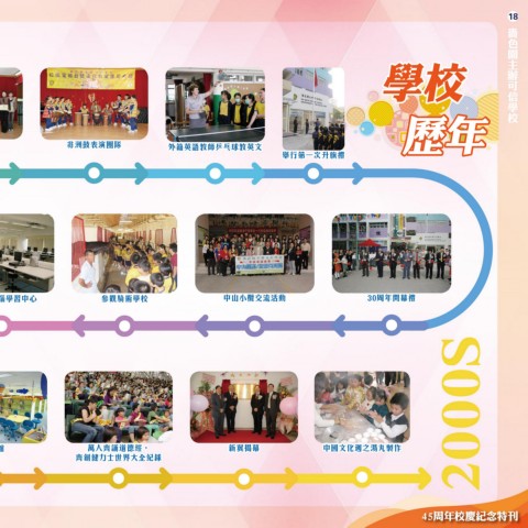 18 嗇 色 園 主 學校 辦 可 信 學 校 歷年 家教會教師委員 非洲鼓表演團隊 外籍英語教師乒乓球教英文 舉行第一次升旗禮 多媒體電腦學習中心 參觀騎術學校 中山小欖交流活動 30周年開幕禮 圖書館 萬人齊誦道德經, 新翼揭幕 中國文化週之湯丸製作 2000S 齊創健力士世界大全紀錄 45周年校慶紀念特刊
